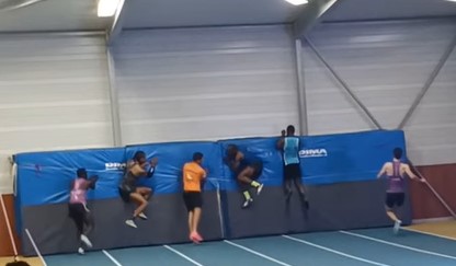 Sur un 60m dans un gymnase on finit en s'écrasant contre des tapis en mousse