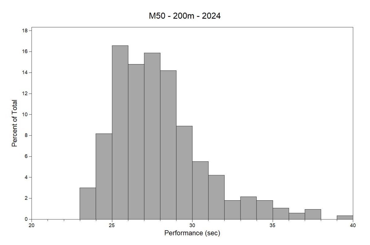 Pour vous donner un exemple, voici l'histogramme des performances pour le 200m des hommes en M50. La Médiane est 27"52 et la Moyenne 28"21.