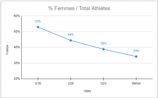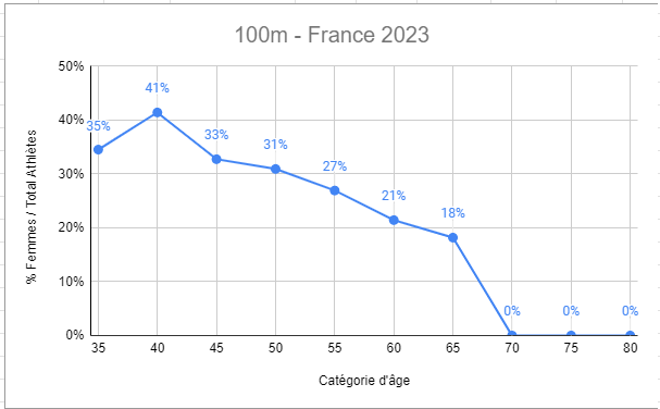Mais pour l'année 2023 en France le nombre et le pourcentage d'athlètes femmes décroit après quarante ans pour le 100m.