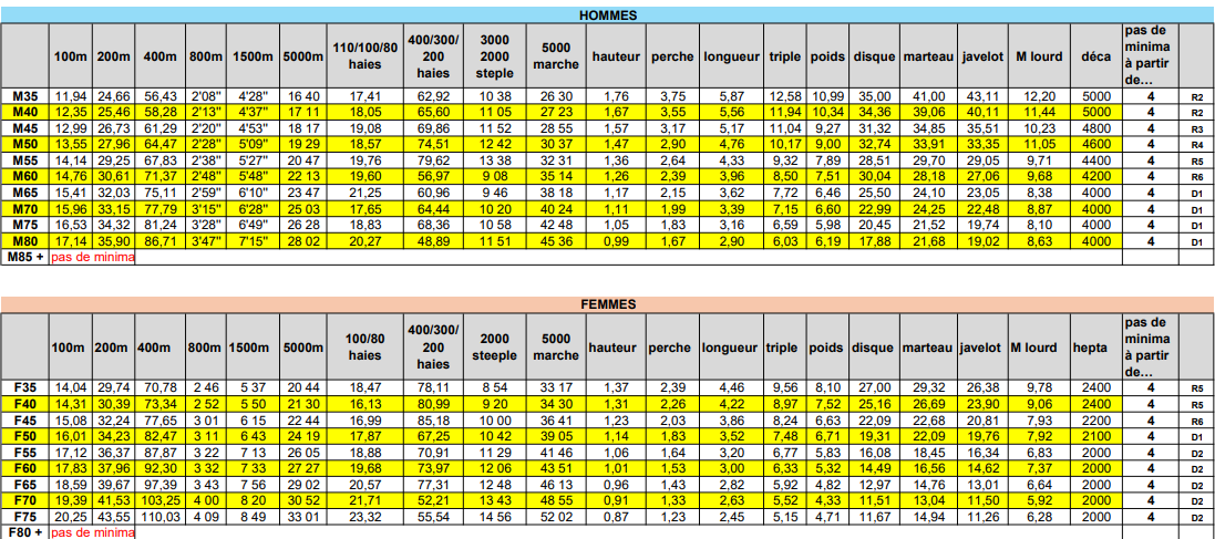 Voici le tableau des performances à réaliser, communiqué par la commission d'athlétisme Masters en France en 2024, pour avoir le droit à sa médaille, si il y a moins de 4 athlètes dans une épreuve: