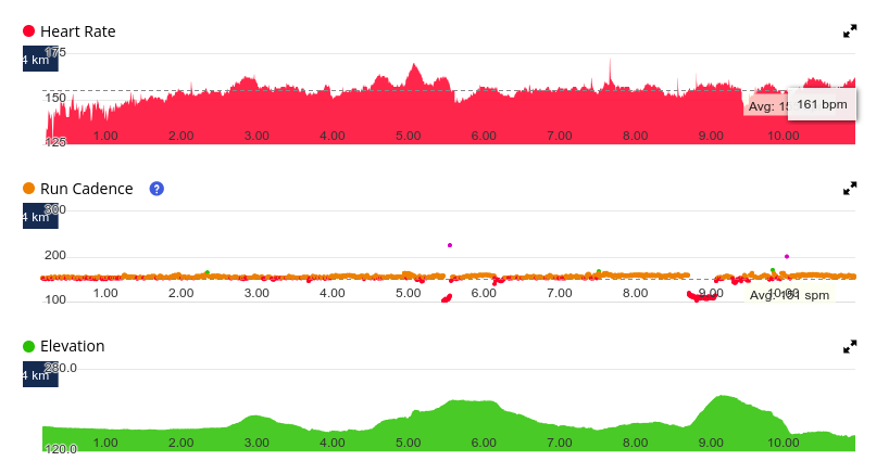 Ce n'est pas une course sur terrain plat et donc il faut aussi gérer son allure dans les côtes. J'ai été un peu optimiste sur la deuxième et en voulant garder un allure assez élevée j'ai juste réussi à monter mon cardio a mon maximum à 173bpm et j'ai senti une légère douleur au mollet droit en doublant quelqu'un dans la côte et donc en faisant une foulée un peu trop appuyée pour me relancer. Heureusement, c'était juste avant une longue partie en descente, ce qui m'a permis de récupérer un peu d'énergie.
