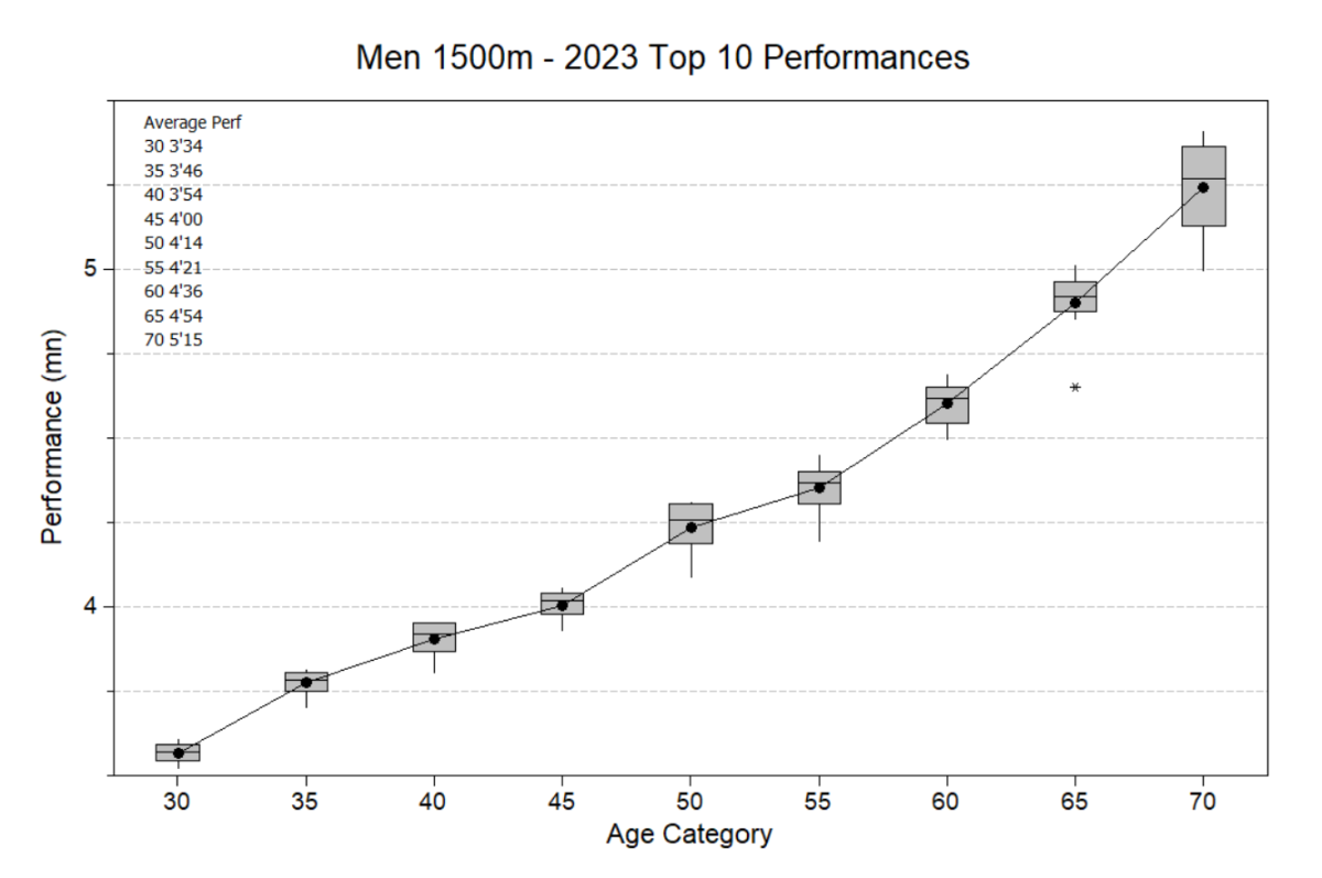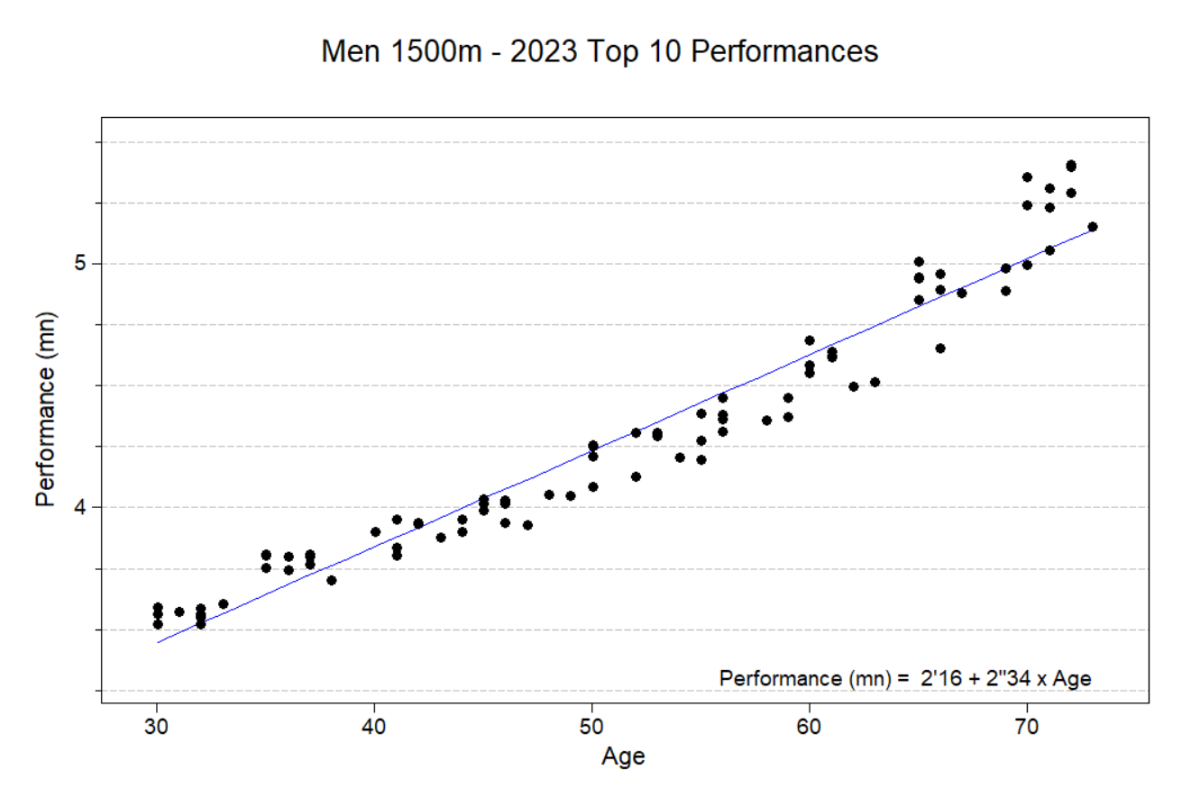 Pour le 1500m, chez les hommes les temps de course s'allongent de 2"34 sec par année d'âge.