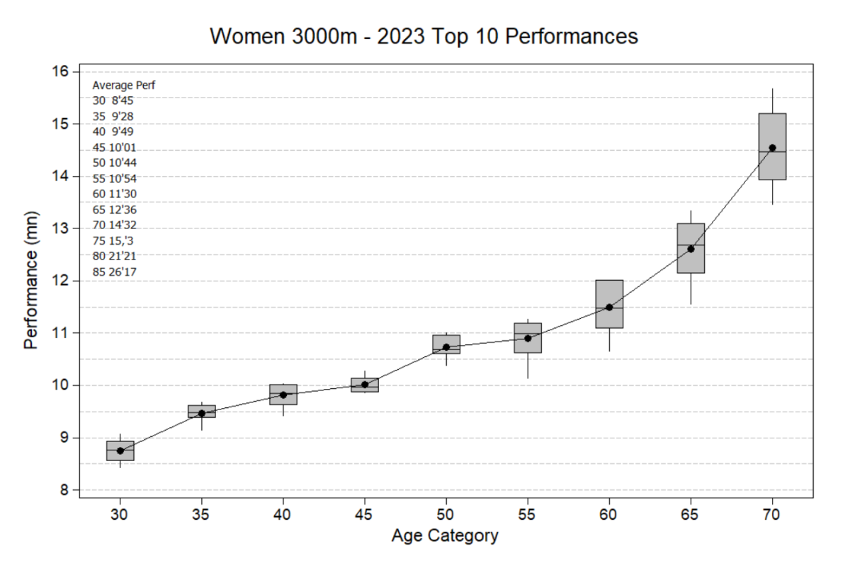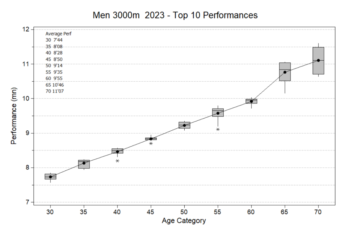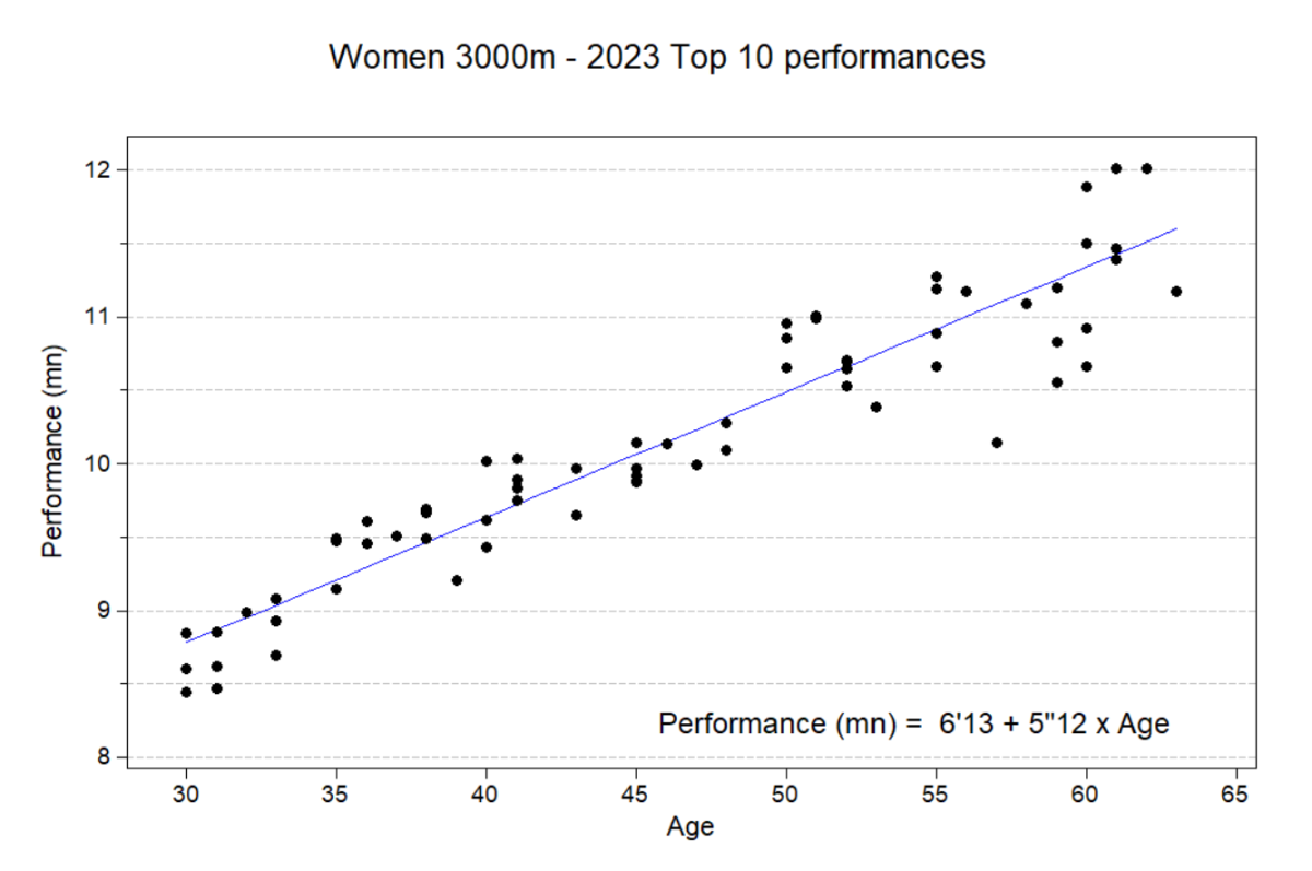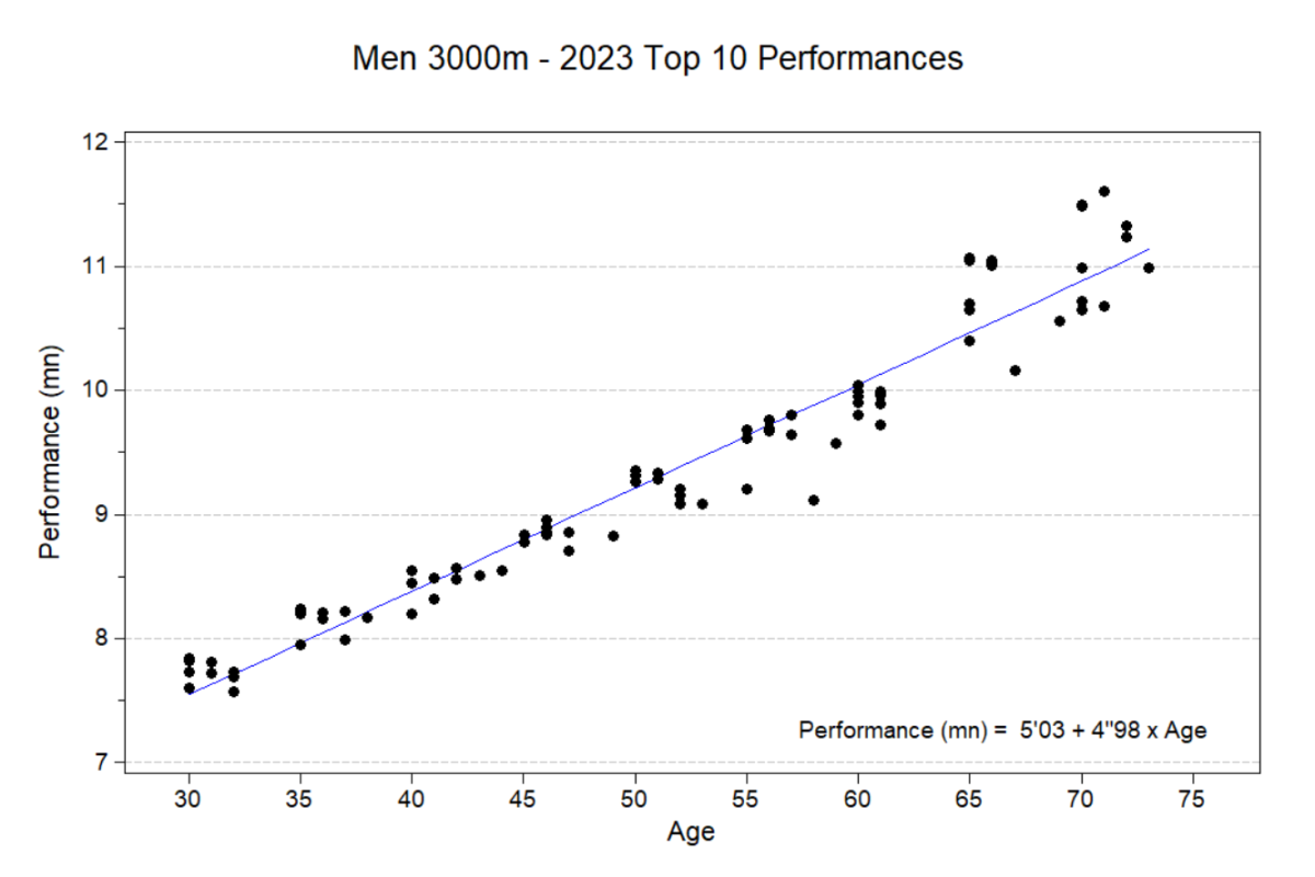 Chez les hommes, comme chez les femmes les temps de course du 3000m s'allongent d'environ 5" par année d'âge.