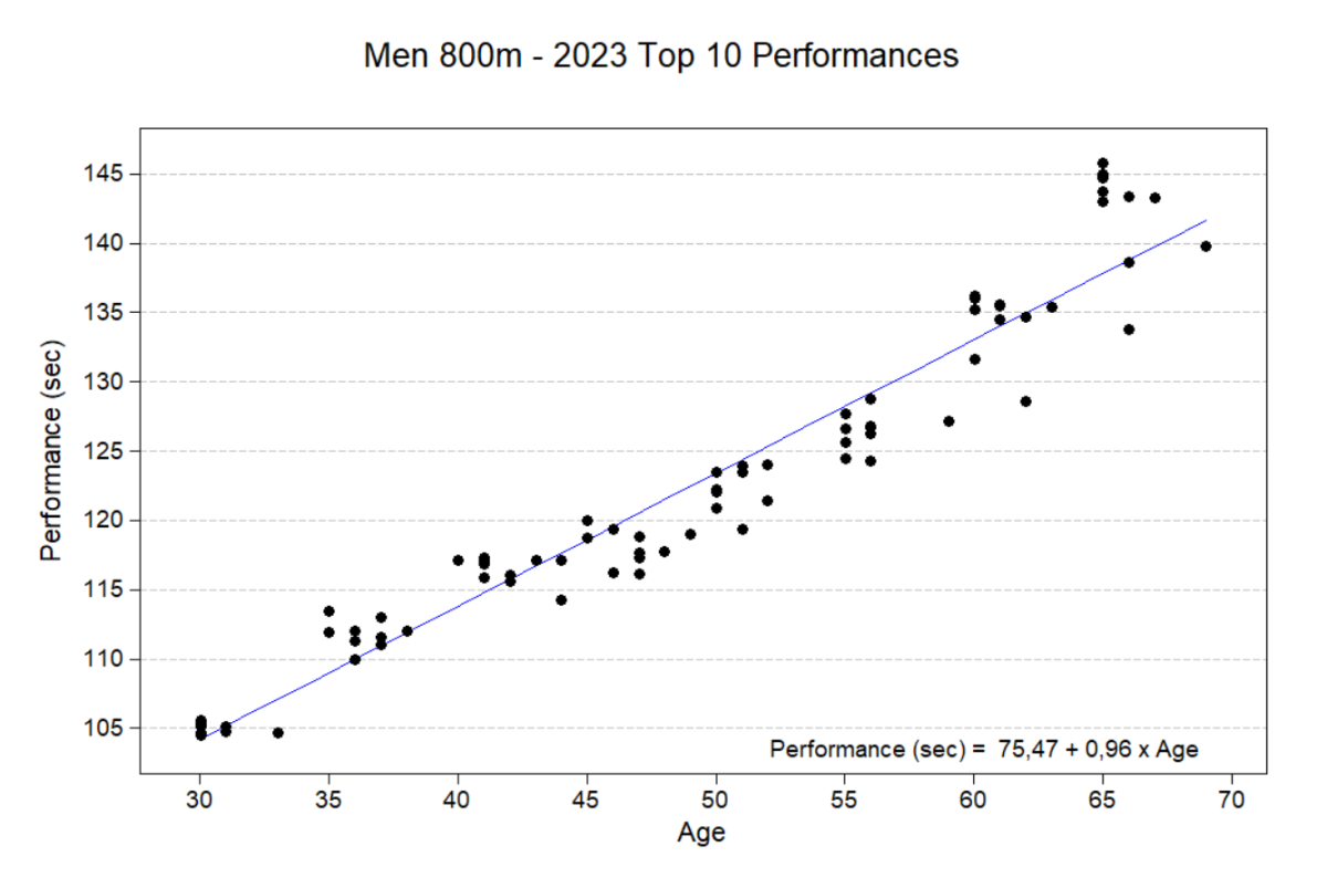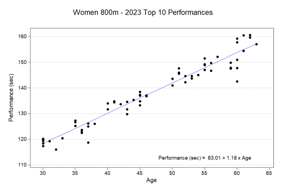 Pour le 800m, il y a une différence de cette augmentation du temps de course par année d'âge entre les hommes et les femmes, avec une augmentation moyenne d'un peu moins de 1.00sec pour les hommes, et de 1.20sec pour les femmes.