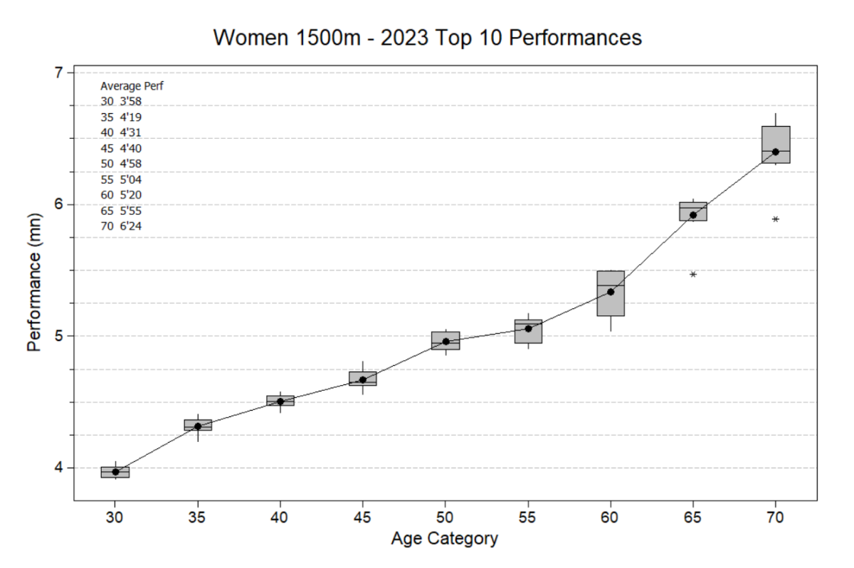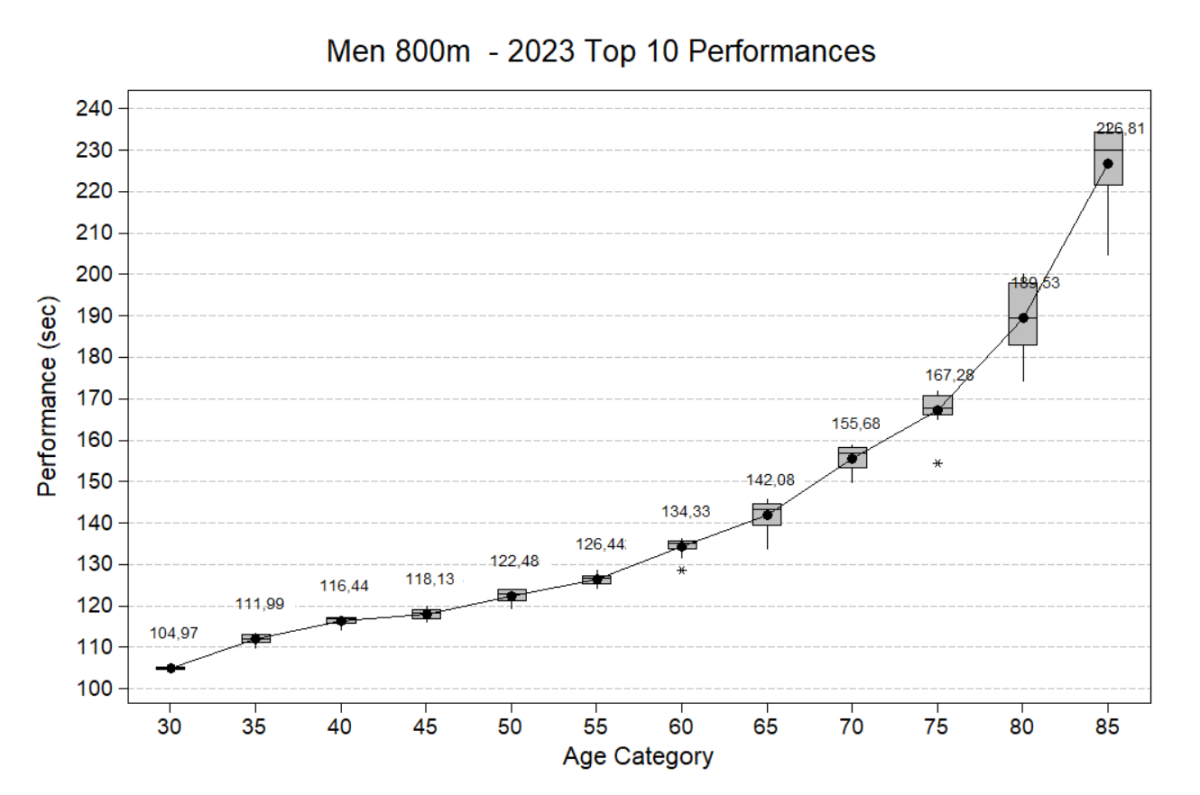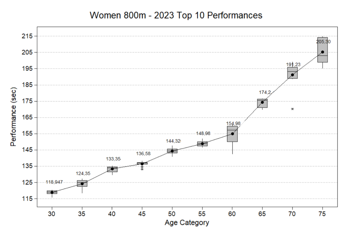 Comme discuté à la page Performances, comme en sprint, les temps de course moyens en demi-fond augmentent quand on avance en âge.