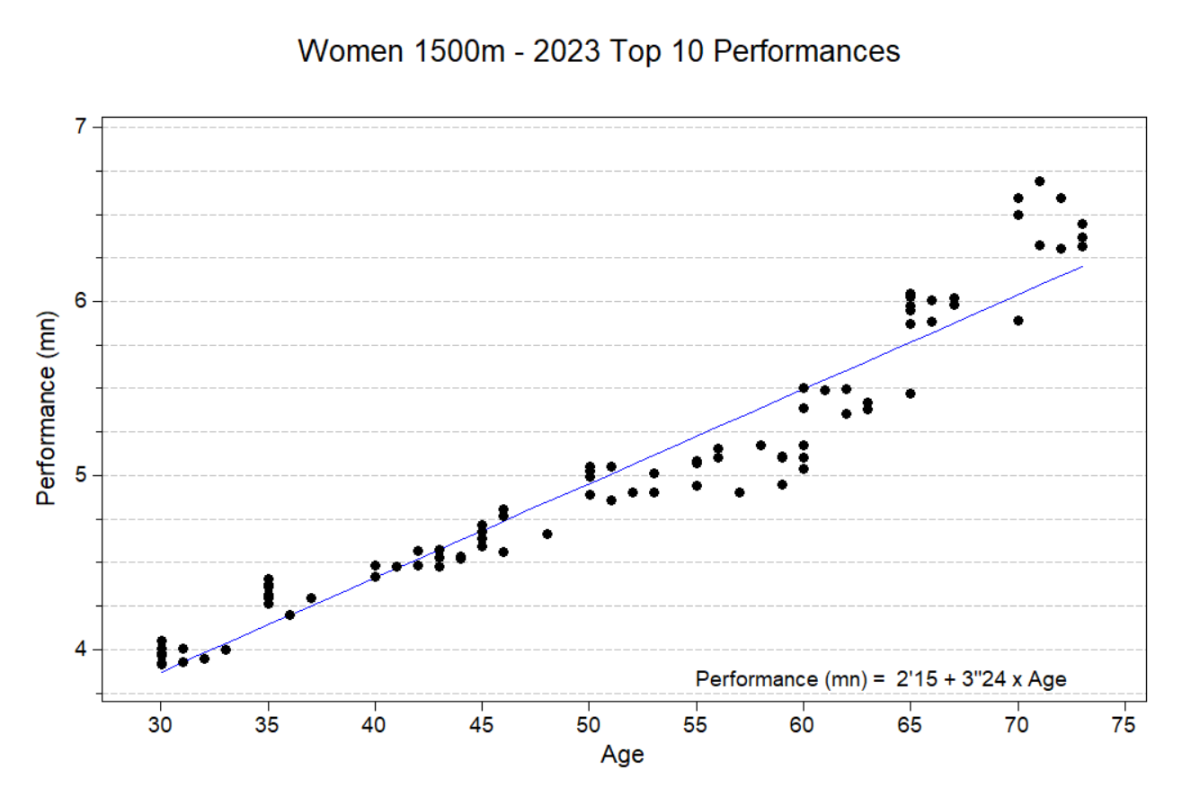 Chez les femmes les temps de course du 1500m s'allongent de 3"24 par année d'âge.