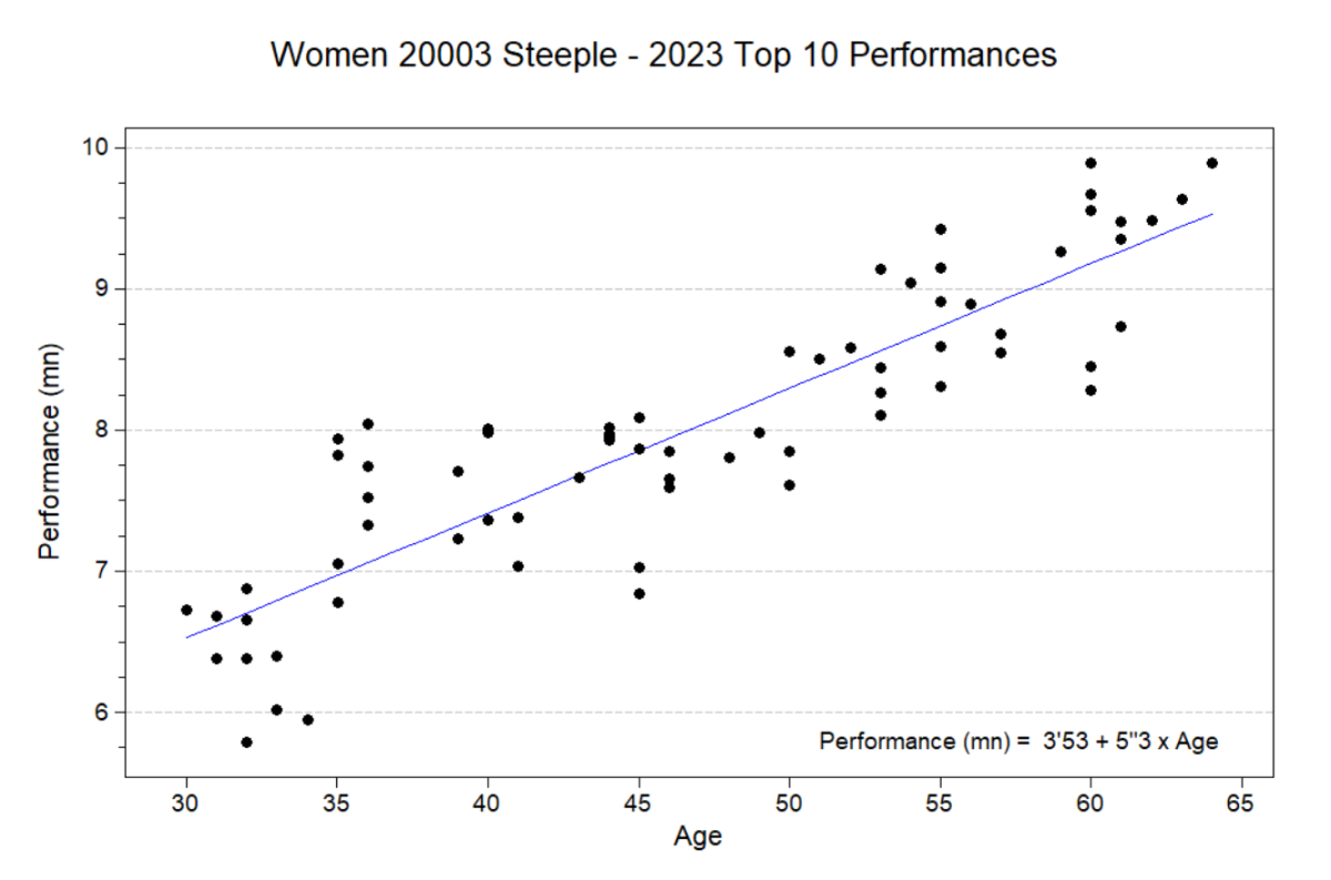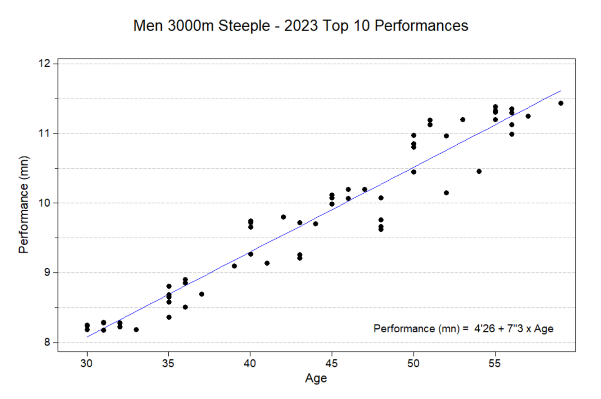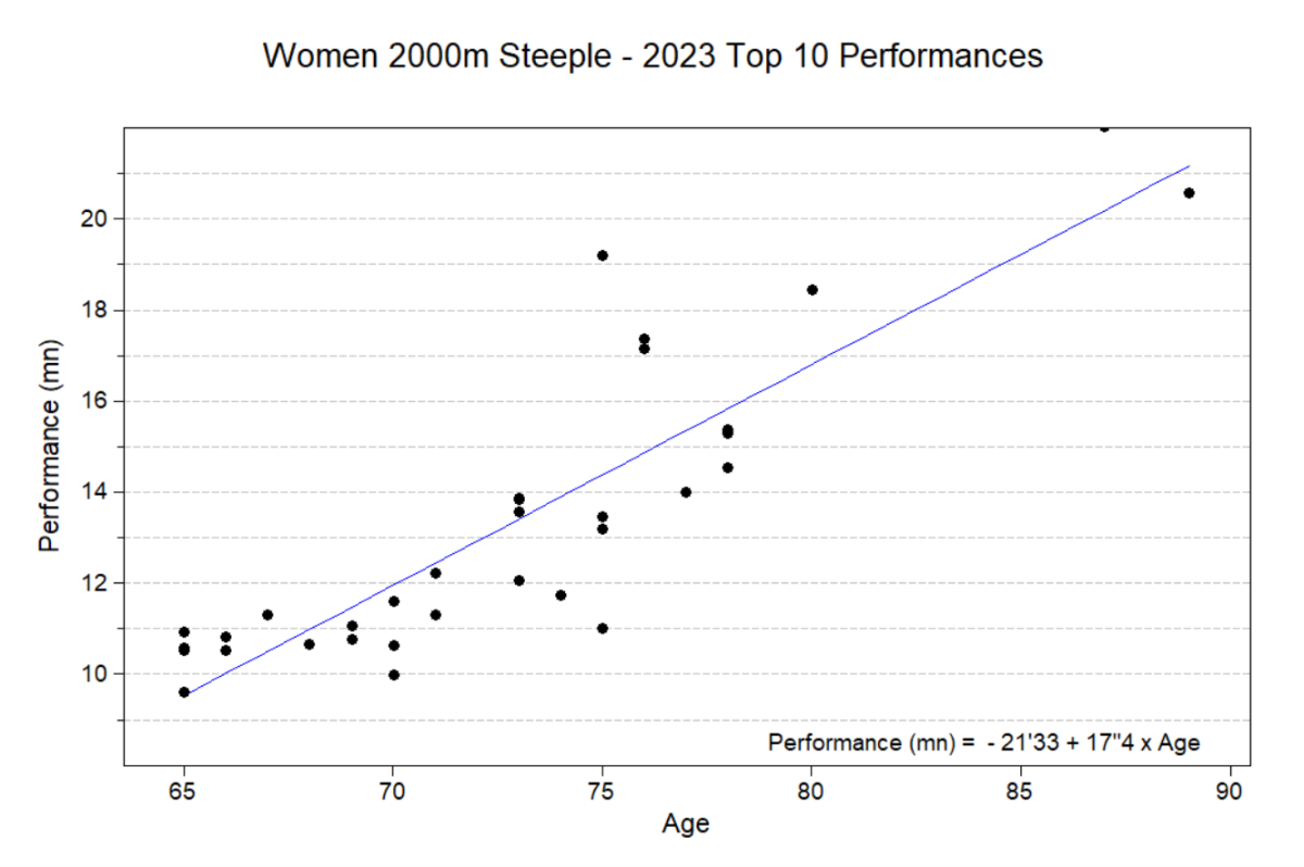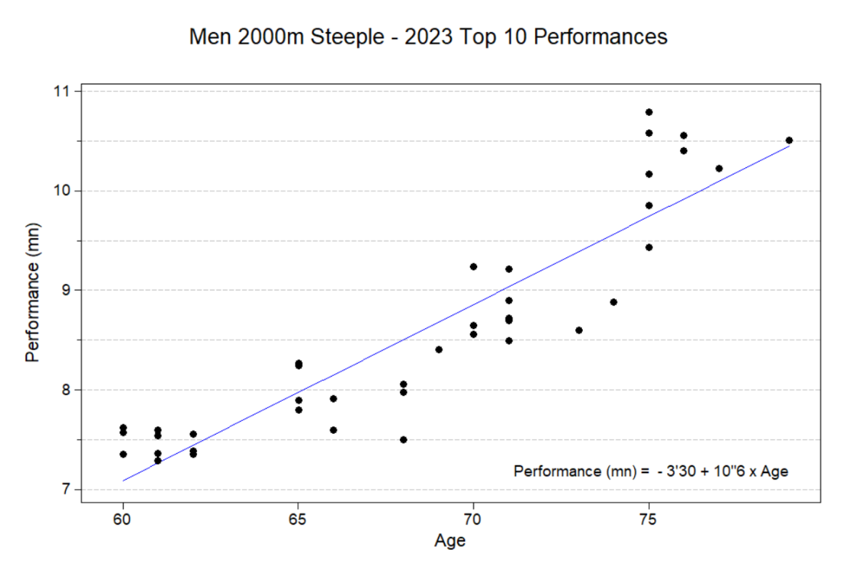 En utilisant les temps de course pour les tranches d'âge où cette évolution est presque linéaire on peut calculer des formules de régressions pour les différentes courses. Bien que pour certains échantillons la marge d'erreur est importante, on peut quand même avoir une idée de ces baisses de performance.