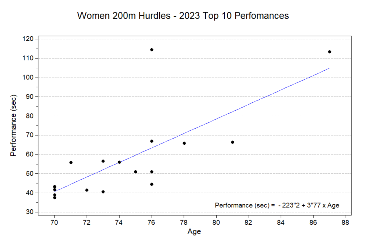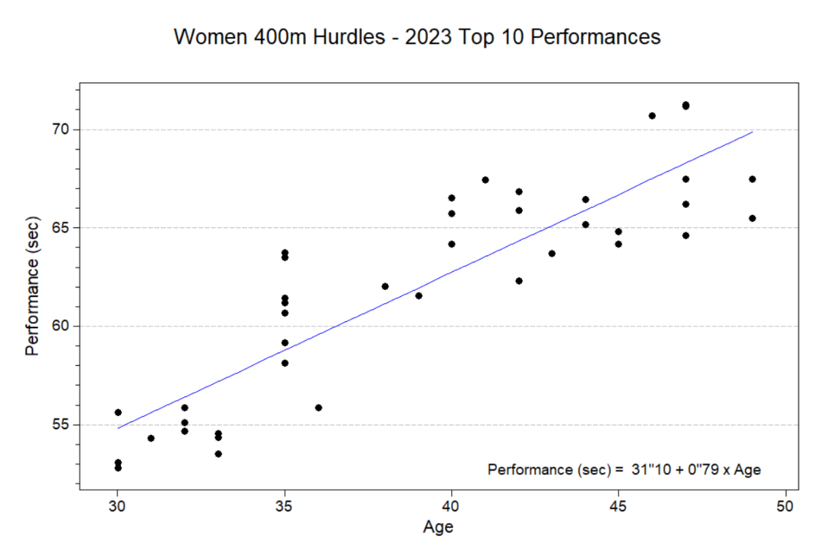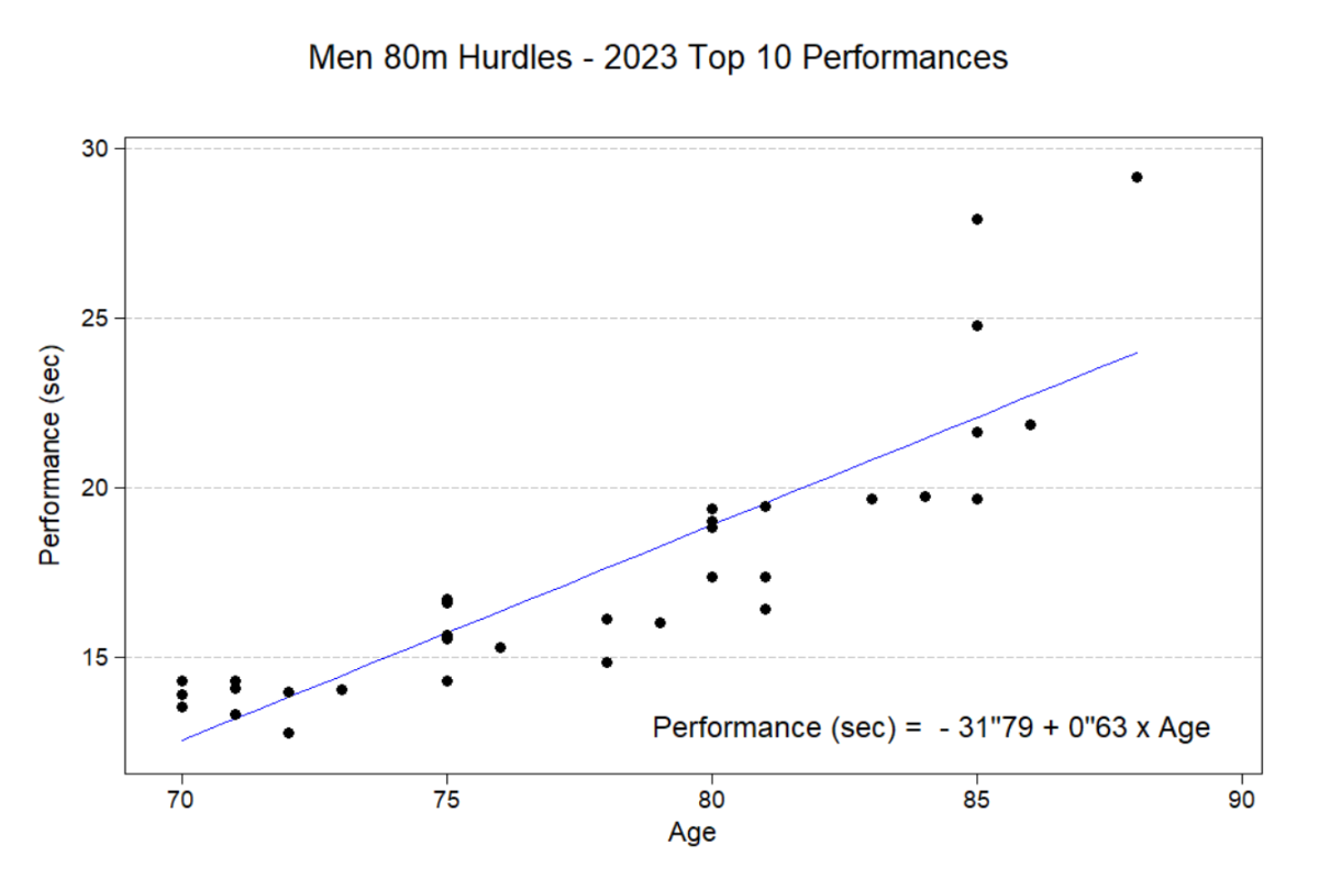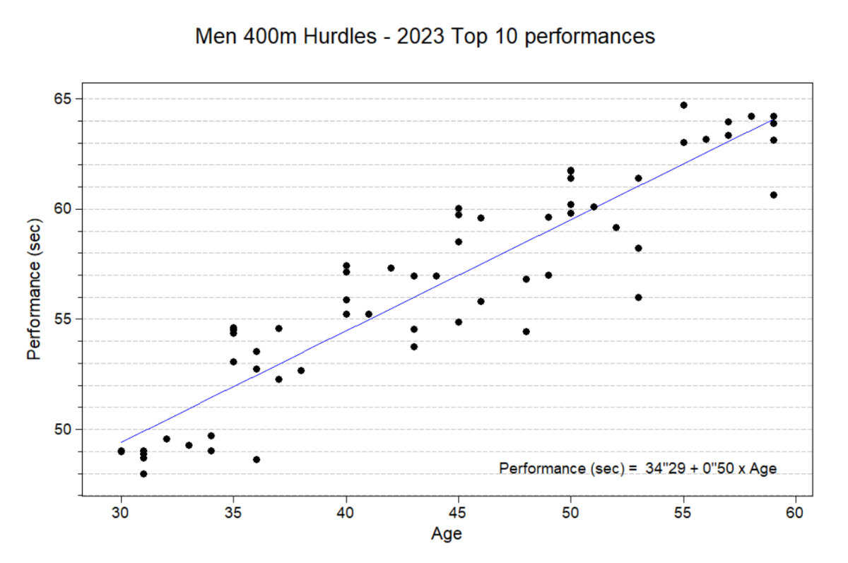 En utilisant les temps de course pour les tranches d'âge où cette évolution est presque linéaire on peut calculer des formules de régressions pour les différentes courses. Bien que pour certains échantillons la marge d'erreur est importante, on peut quand même avoir une idée de ces baisses de performance.