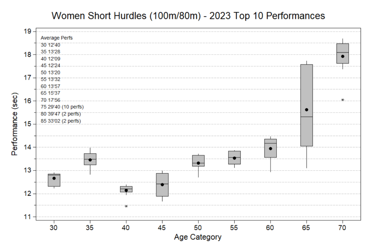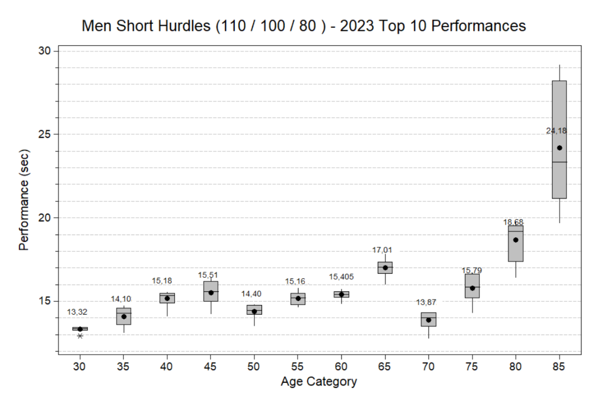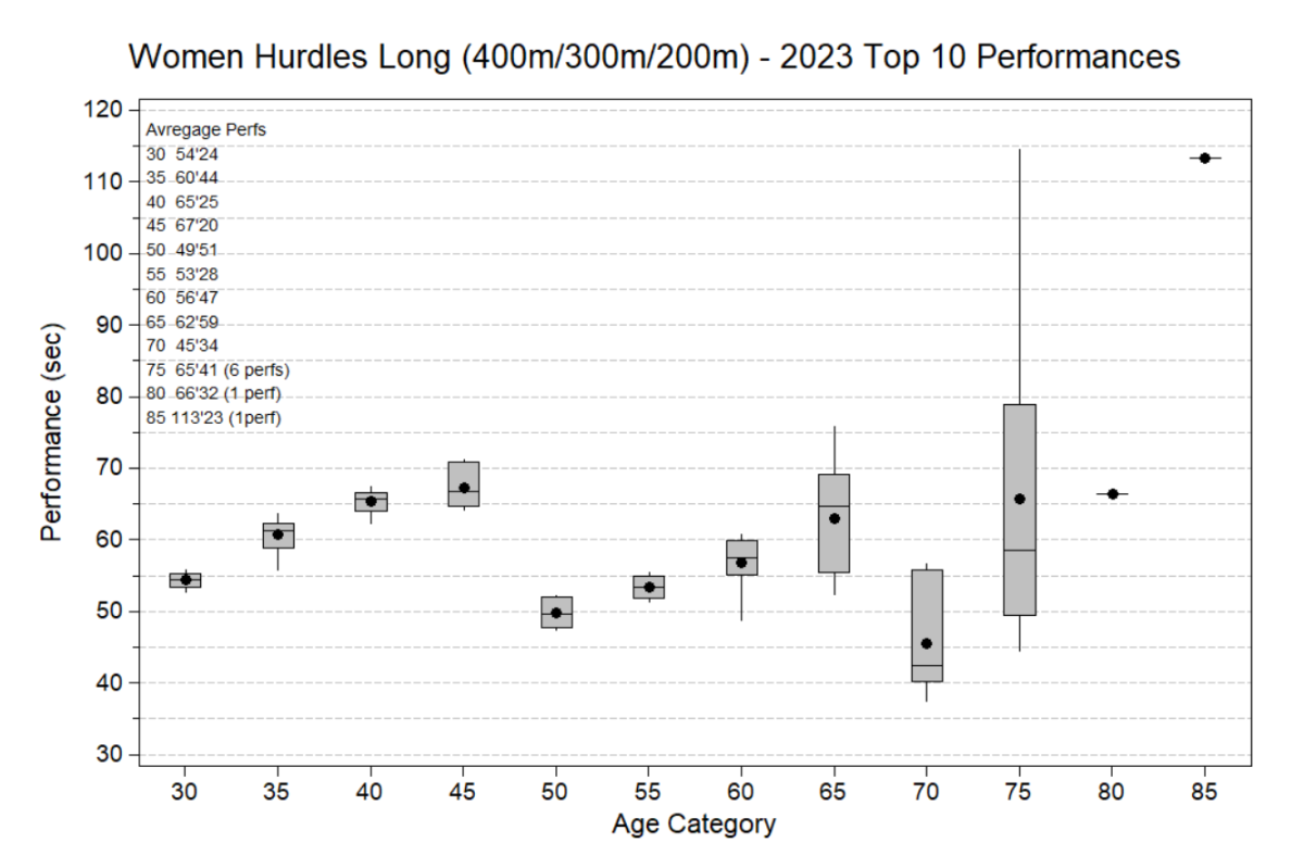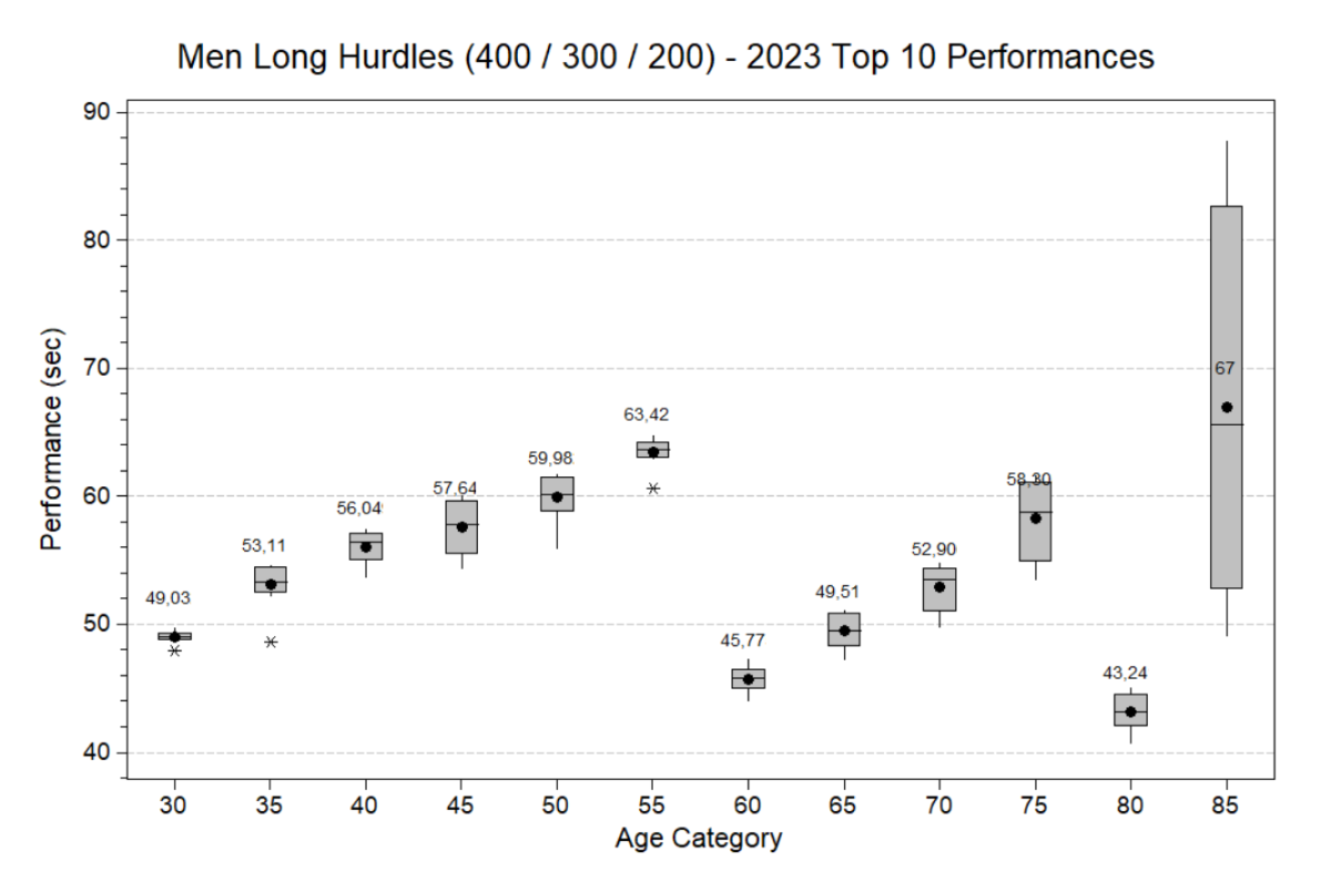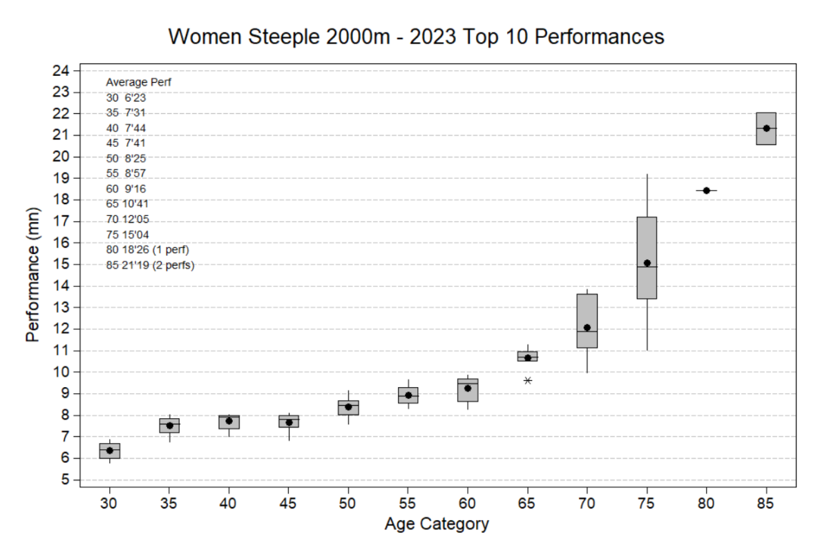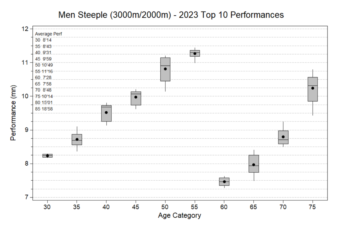 Comme discuté à la page Performances, les temps de course moyens en sprint augmentent quand on avance en âge, est c'est également le cas pour les course de haies et le steeple.