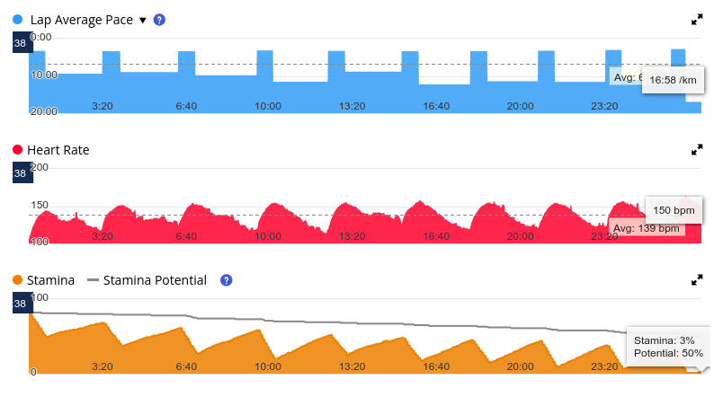 Ayant fait une échauffement long de 4km, j'ai commencé cette séquence avec seulement 72% de Stamina, et j'ai fini à 7%