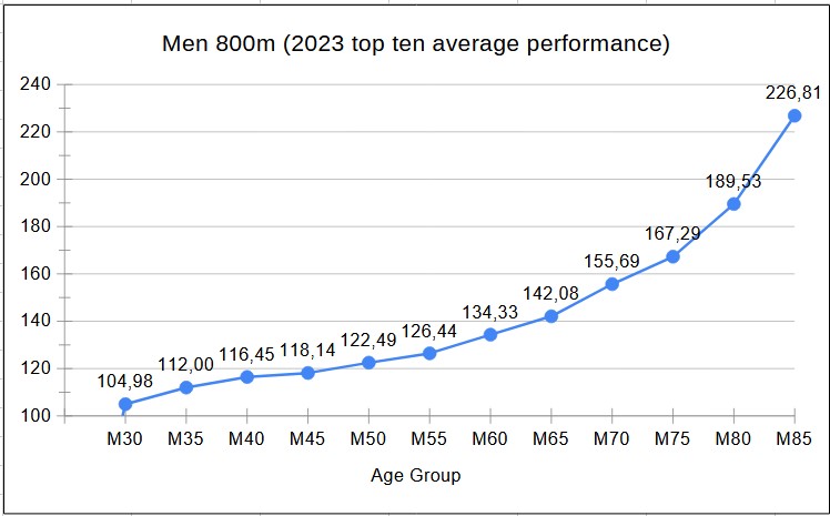 Pour le 800m cette augmentation est de 4"75 pour les hommes entre les catégories M30 et M65, et de 5"30 pour les femmes entre les catégories W30 et W60, avec une augmentation plus importante après ces tranches d'âge.